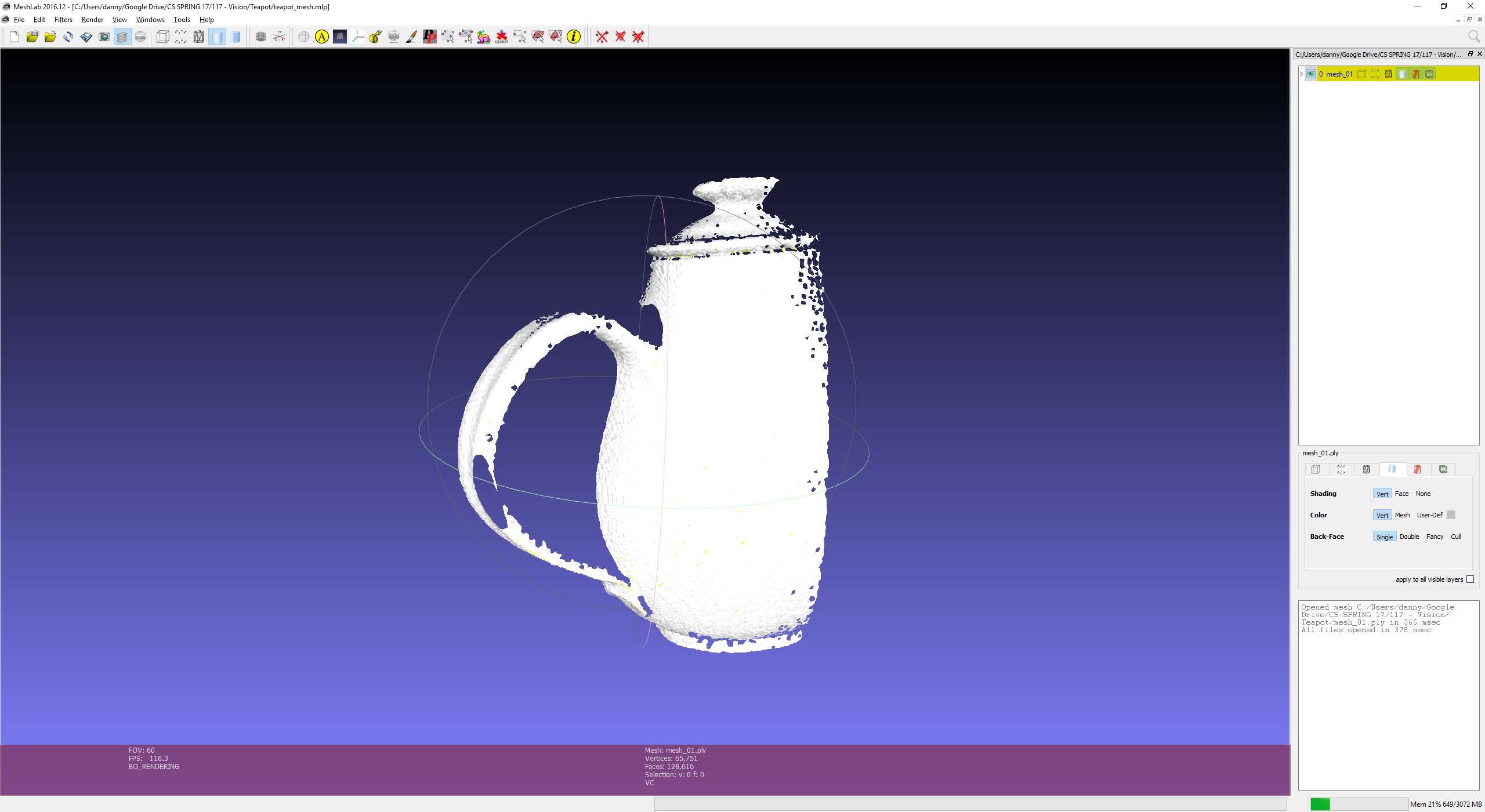 The individual meshes are then loaded into Meshlab for alignment. The user is required to set the initial points for Meshlab to run its iterative closest point (ICP) alignment algorithm. This works by overlaying the meshes in an initial configuration set by the user, and modifying its location in an attempt to minimize the difference in distances between both point clouds. Once Meshlab has finished with the ICP and all meshes have been aligned, the mesh is flattened and exported as a ‘.ply’ file.
