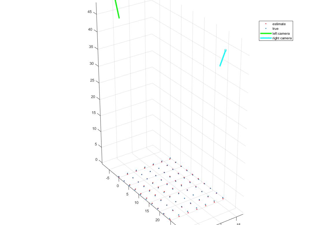 After initial extrinsic parameters are set, the algorithm optimizes these parameters over the rotation and translation variables (focal point and principle offset are fixed). The provided function ‘lsqnonlin’ solves the nonlinear least-squares by finding a set of parameters that minimizes the total error between the given 3D points projected through the camera in 2D with varied settings and the given 2D points while attempting to avoid settling at local minima. After the function has minimized the error in the parameters, the camera’s extrinsic properties are set and returned along with the 2D point set from the grid, and the estimated 3D point set from the triangulation of the two cameras with the optimized parameters.
